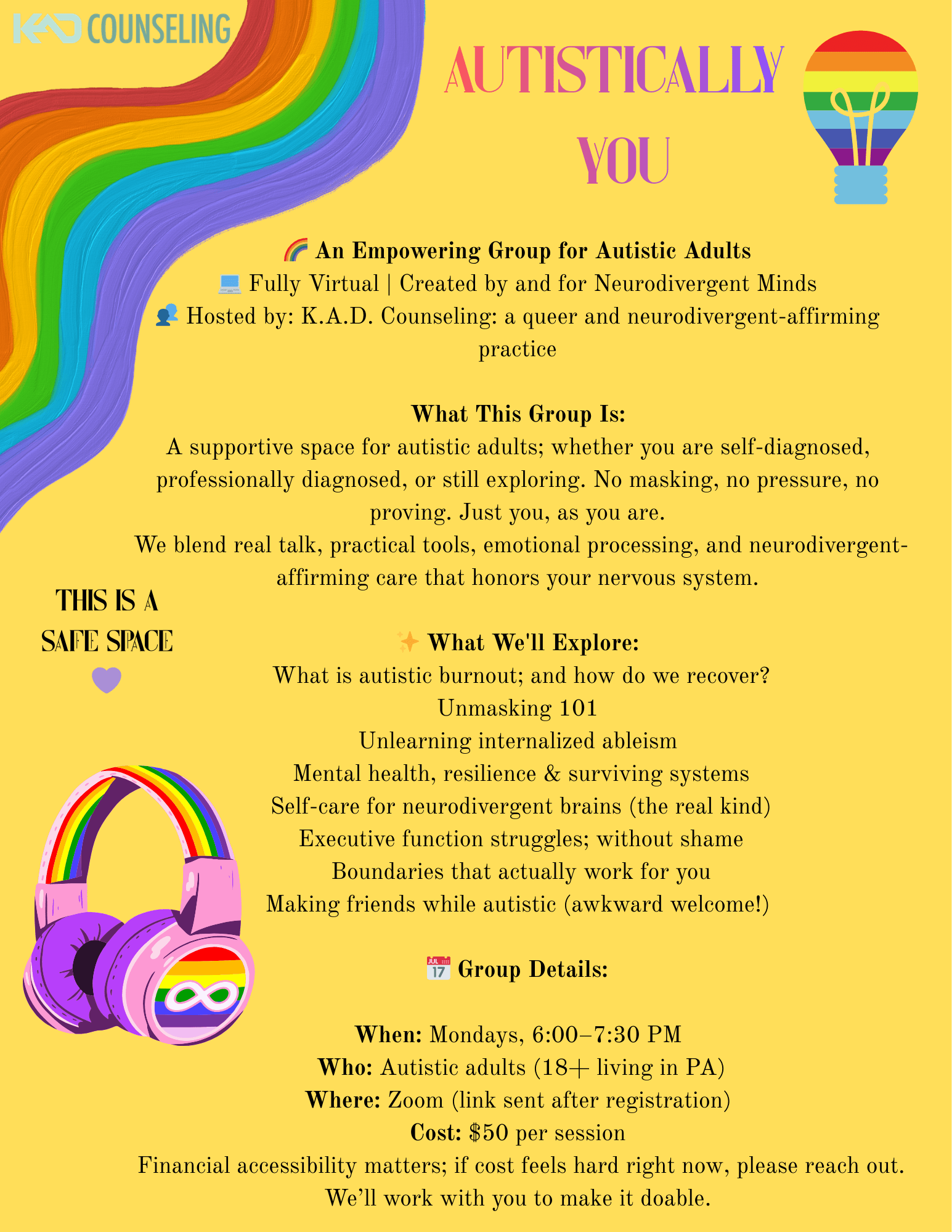 We’re making some updates to better reflect who we are and who we serve. You might notice a few shifts as we align even more with our values: neurodivergent affirming, queer affirming, and radically human care. 💛 Thanks for your patience as we fine-tune things behind the scenes. We’re still here, and we’re not going anywhere!💛