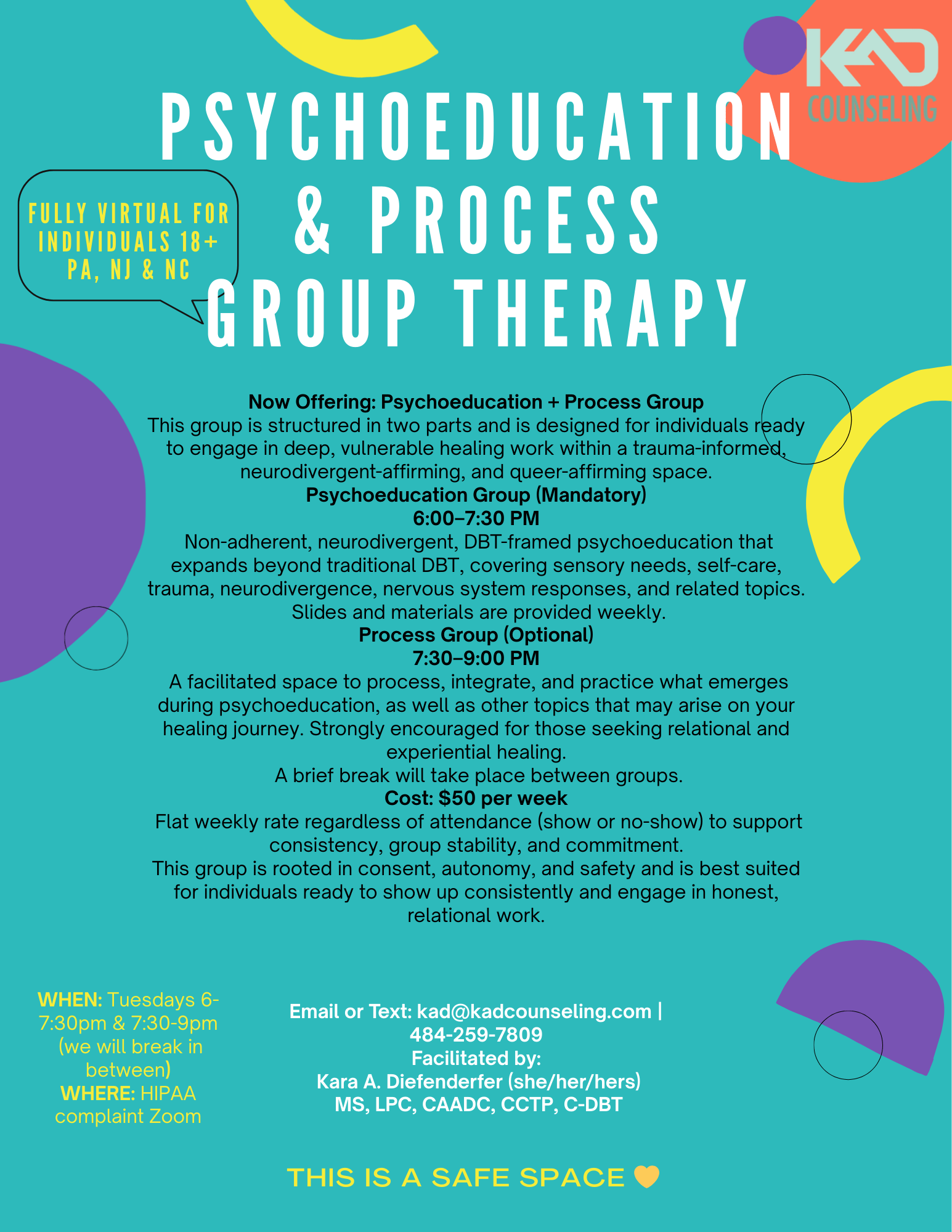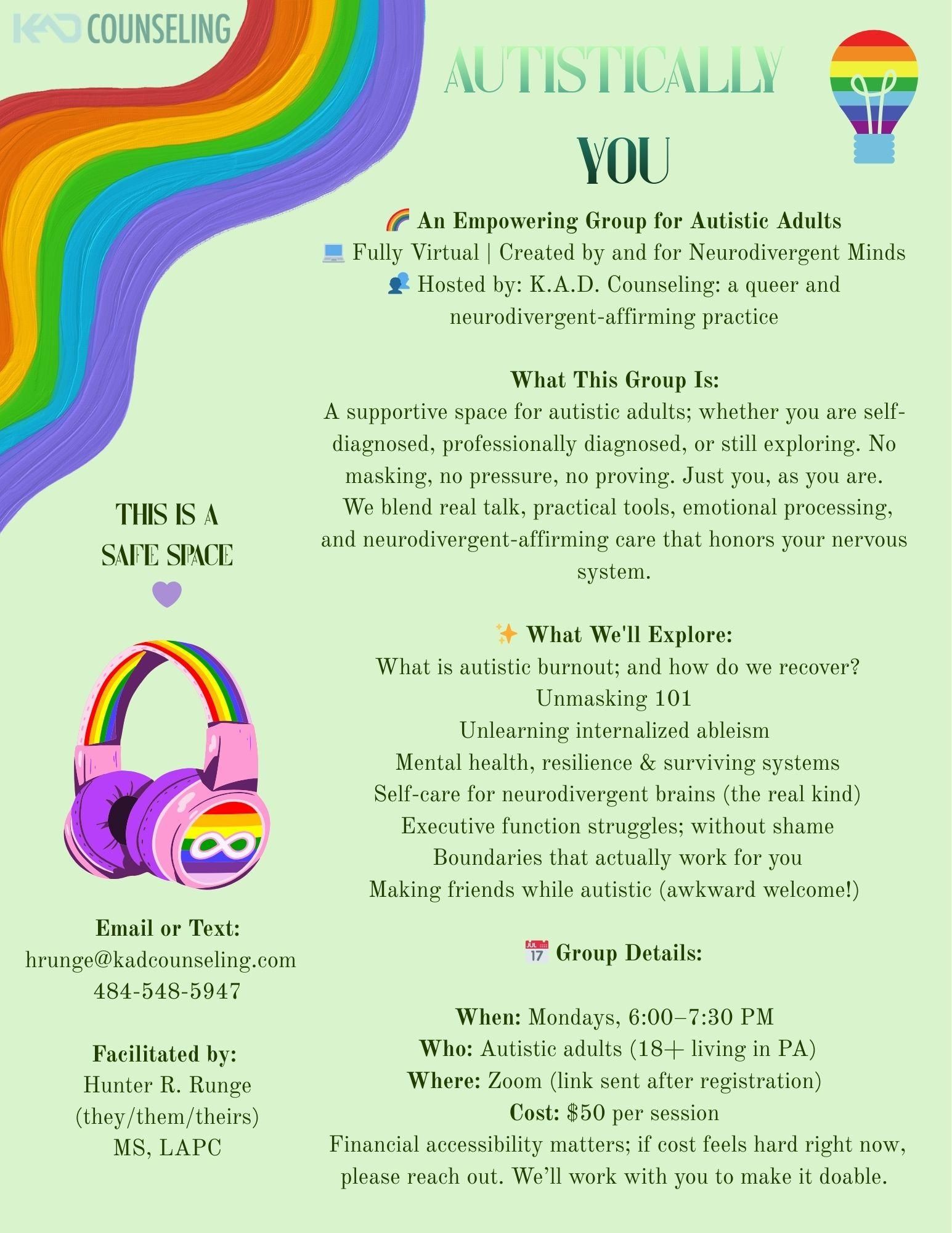 🏳️🌈 K.A.D. Counseling is a woman, queer, and neurodivergent owned mental health practice dedicated to providing radically affirming care across all areas of identity and experience.